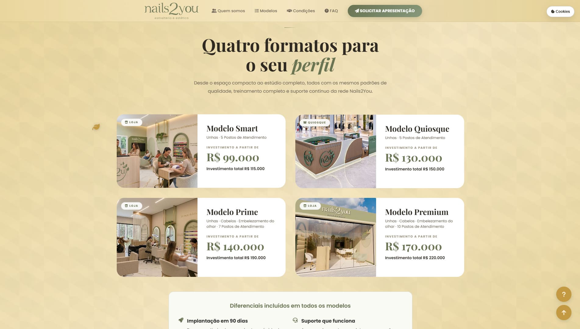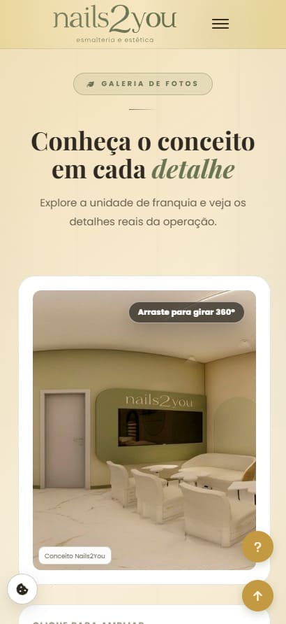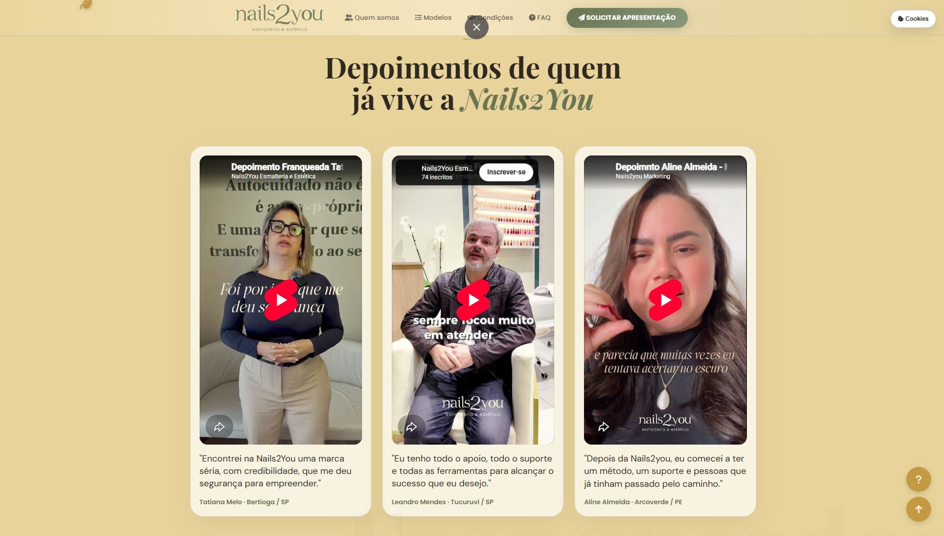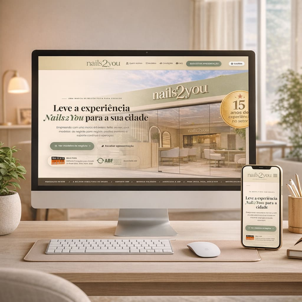 O projeto da Nails2You foi concebido com foco direto em expansão de franquias, transformando o website em um ativo comercial estratégico e não apenas institucional. A estrutura foi pensada para educar, qualificar e conduzir o usuário até a solicitação de apresentação, reduzindo fricções no processo de decisão.